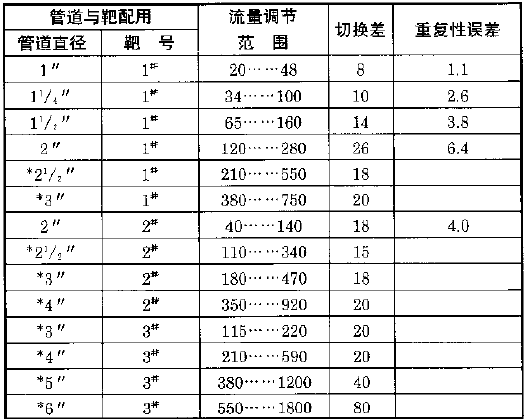 注:1.*號數(shù)據(jù)為參考數(shù)據(jù);2.流量調(diào)節(jié)范圍:指下切換值調(diào)節(jié)范圍,即流量減少時引起開關(guān)觸點(diǎn)切換的設(shè)定值調(diào)節(jié)范圍;3. 4#,5#靶可以用于更大直徑的管道。