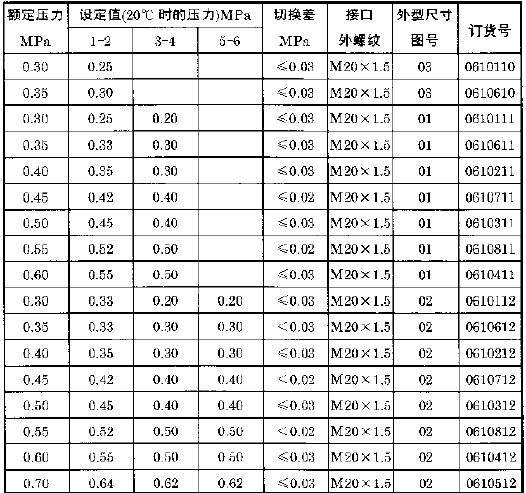 注:1.表內(nèi)設定值亦可根據(jù)用戶要求而定,報警和閉鎖的壓力差應優(yōu)先選用≥0.05MPa數(shù)值,額定壓力及設定值有特殊要求請在訂貨時注明。