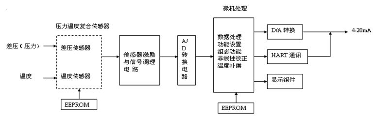 傳感器的電容量變化,通過(guò)特定的高頻激勵(lì)與檢測(cè)電路將其轉(zhuǎn)換為直流電信號(hào),通過(guò)信號(hào)調(diào)理電路轉(zhuǎn)換為一定幅度的電壓信號(hào),經(jīng) A/D(模擬/數(shù)字)轉(zhuǎn)換為數(shù)字量的信號(hào)送至 CPU 處理,所檢測(cè)到的溫度信號(hào)同樣轉(zhuǎn)換為數(shù)字信號(hào)送至 CPU 處理、上述兩個(gè)信號(hào)經(jīng)微處理器的程序運(yùn)算,并經(jīng) D/A(數(shù)字/模擬)轉(zhuǎn)換 以及 HART 通信電路處理,將壓力及溫度參數(shù)轉(zhuǎn)換成所需的4~20mA 標(biāo)準(zhǔn)直流電流信號(hào)及符合 HART 協(xié)議的數(shù)字信號(hào)并調(diào)制在二線制電流信號(hào)上,提供給用戶使用,同時(shí)驅(qū)動(dòng)顯示器顯示。變送器內(nèi)置的微處理器在計(jì)算機(jī)程序(軟件)的支持下完成所需的特定功能。