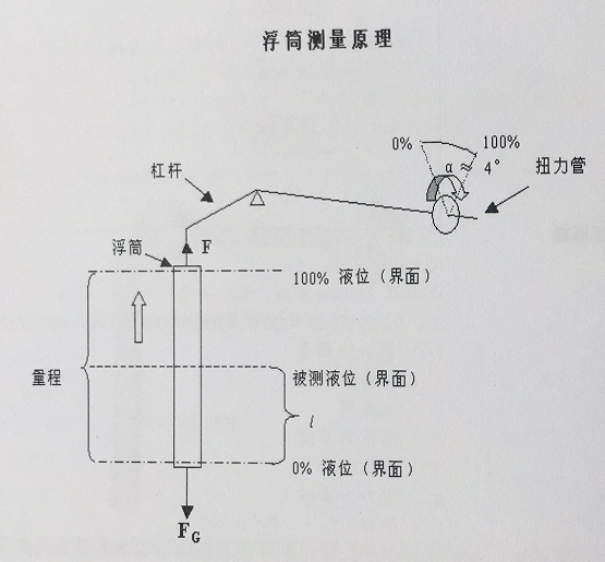 當(dāng)被測(cè)液體上下變化時(shí),浸在液體中浮筒的體積大小發(fā)生變化,浮筒受到浮力的大小也發(fā)生變化時(shí),浮力大小等于r2 ′ p ′ L ′ p ′ g ( r為浮筒半徑,L為浮筒浸在液體中的深度,p為被側(cè)液體的比重,g為重力加數(shù)度),懸掛浮筒的杠桿受到的力為浮筒的自重減去浮筒受到的浮力的差。由于浮筒自重不變,浮力隨液體上下而變化,杠桿的受力隨變化,當(dāng)浮筒在被測(cè)液體的零位時(shí),浮力為零,此時(shí)杠桿受力最大,扭力管扭轉(zhuǎn)的角度也最大,一旦杠桿受力減小,扭力管扭轉(zhuǎn)的角度液隨之減小,當(dāng)液體從量程的0%變化100%,扭力管就會(huì)旋轉(zhuǎn)一定的角度,轉(zhuǎn)角輸出到表頭,轉(zhuǎn)換成標(biāo)準(zhǔn)電流輸出,這便是浮筒的測(cè)量原理。